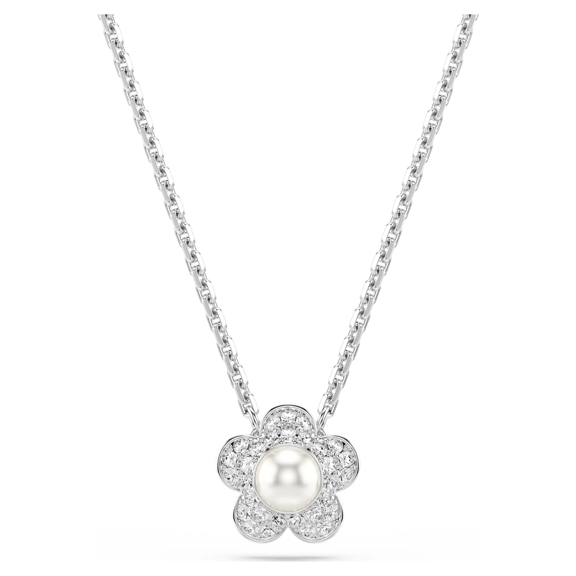 Diese rhodinierte Halskette ist eine zarte Hommage an die Natur und zeigt eine filigrane Blume mit einem Kristallelement im Zentrum und mit schimmerndem Pavé verzierten Blütenblättern. Tragen Sie sie zusammen mit den passenden Ohrsteckern, um jedem Look einen strahlenden Hauch von dezentem Luxus zu verleihen.
