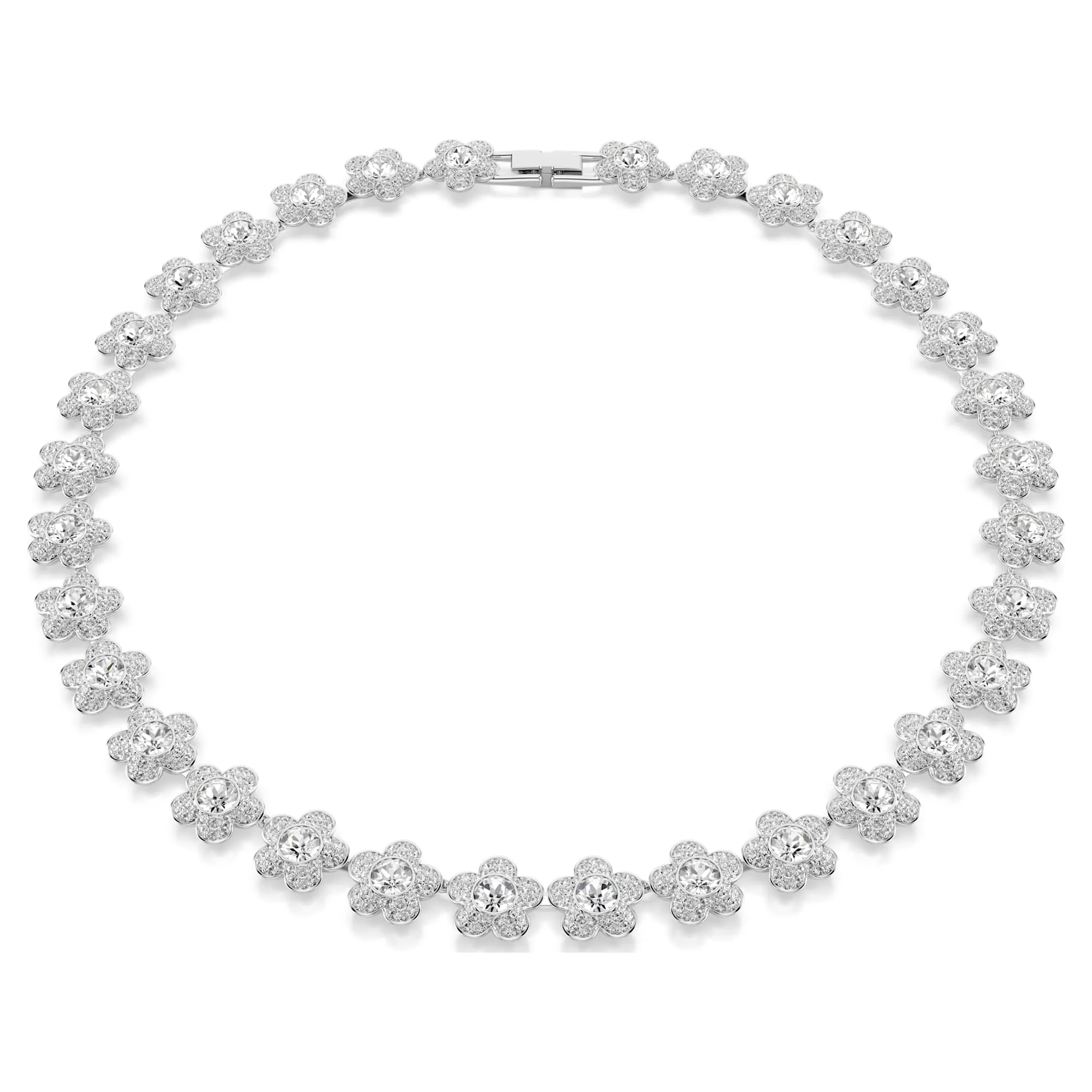 Diese Halskette, die die Schönheit der Natur heraufbeschwört, ist ein rhodiniertes Design mit einer Allaround-Kette voller zarter Blüten. Jede Blüte bezaubert mit einem Kristallelement im Zentrum und Blütenblättern, die mit schimmernden Pavé verziert sind. Diese lichtreflektierende Halskette erinnert an einen strahlenden Gänseblümchenkranz und kann mit dem passenden Armband zu einem zeitlosen Look kombiniert werden.