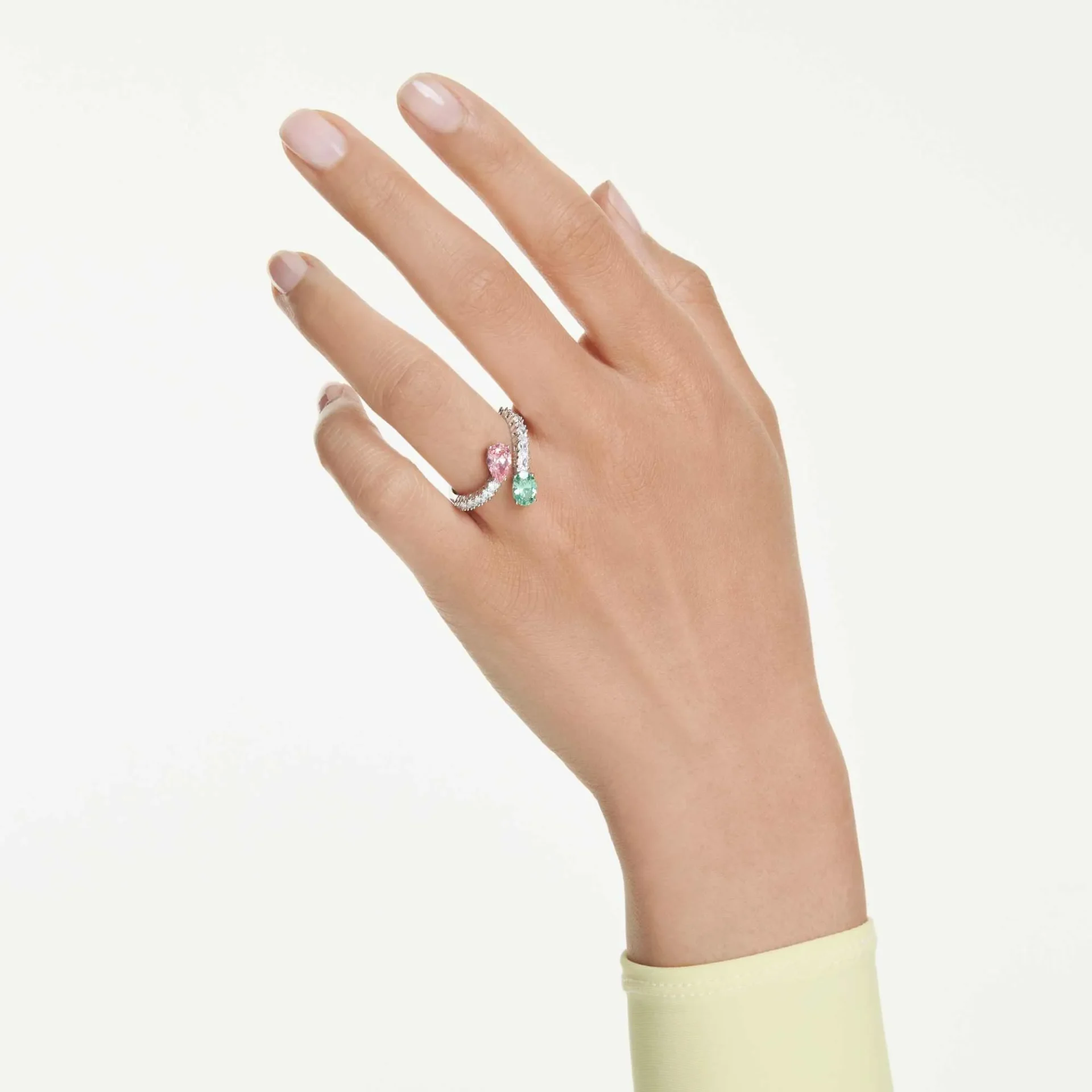 Magische Farben und ein zarter Stil vereinen sich in diesem freudigen Ring. Das offene, rhodinierte Band ist mit klaren Swarovski Zirconia in Pavé-Fassung besetzt, während an den Enden zwei pastellfarbene Swarovski Zirconia schimmern, darunter ein grünes Element im Oval- und ein rosafarbenes im Tropfenschliff. Kombinieren Sie diesen Ring mit passenden Schmuckstücken aus derselben Familie für einen verspielten Allover-Look.