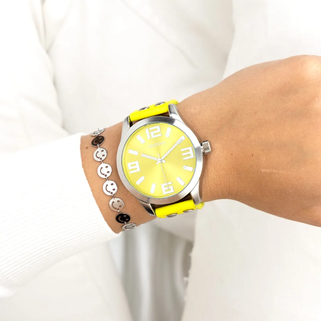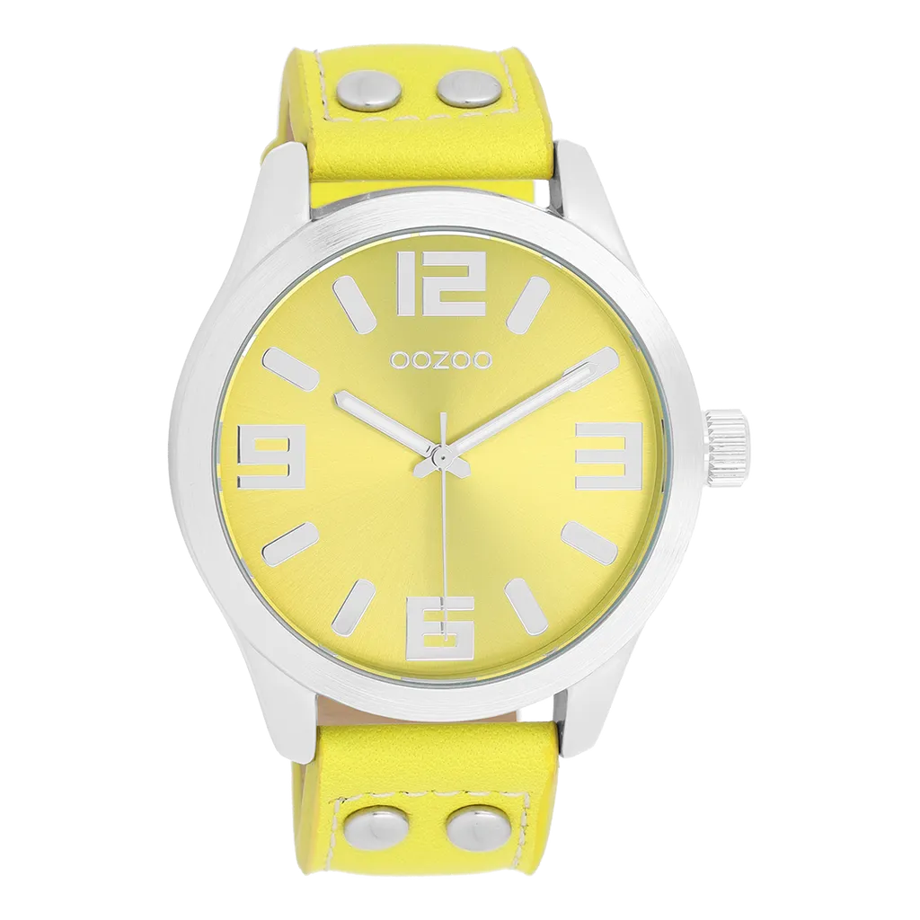 Die OOZOO Timepieces Damenuhr C1071 ist ein echter Hingucker. Das neongelbe Lederarmband harmoniert perfekt mit dem silberfarbenen 46-mm-XL-Gehäuse und schafft einen mutigen, fröhlichen Look.