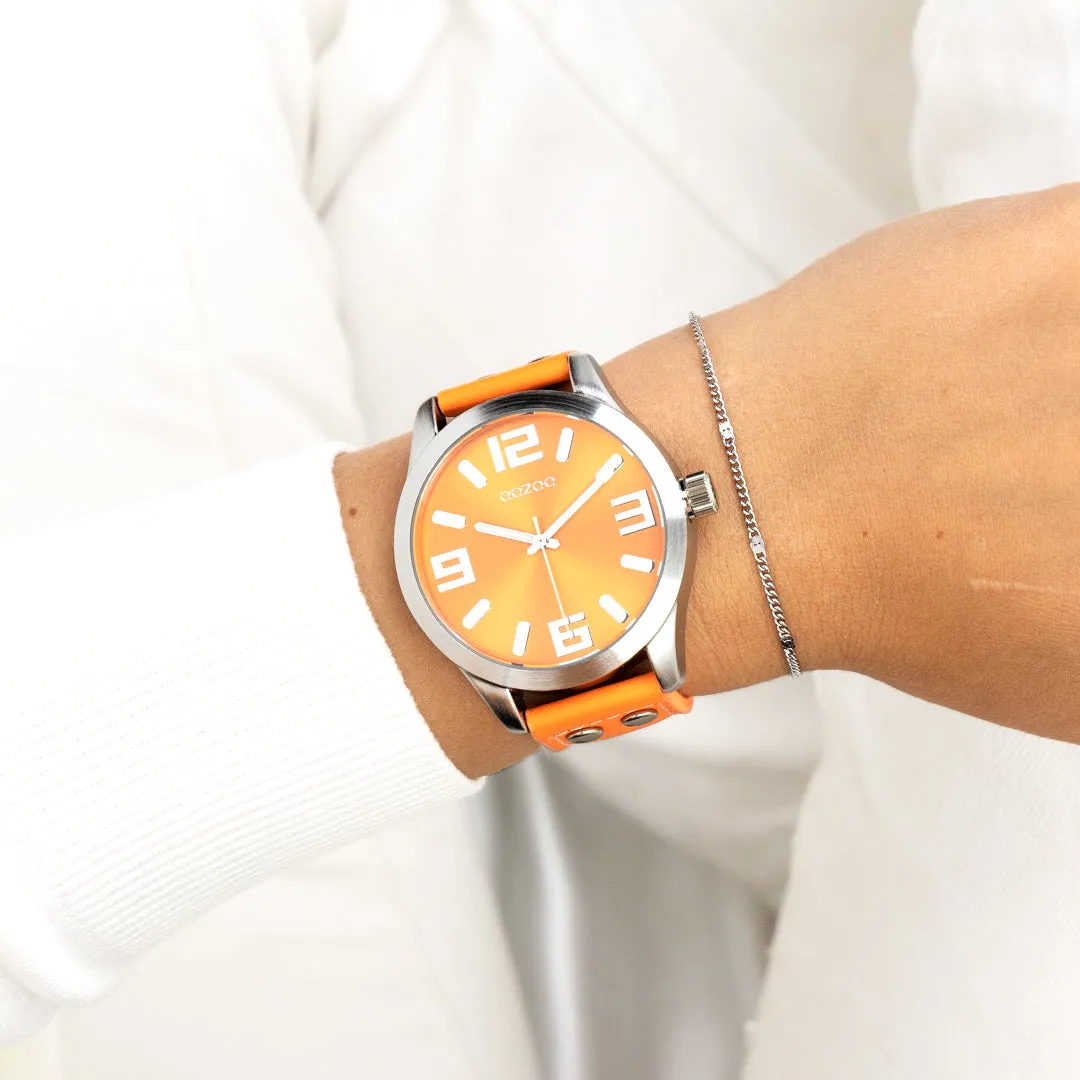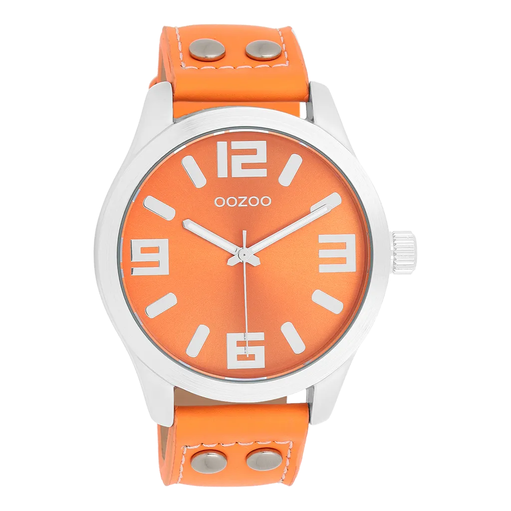 Die OOZOO Timepieces Damenuhr C1072 ist ein echter Hingucker. Das neonorange Lederarmband harmoniert perfekt mit dem silberfarbenen 46-mm-XL-Gehäuse und schafft einen mutigen, energiegeladenen Look.