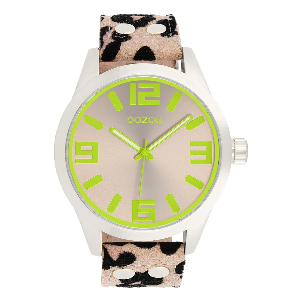 Stiche hervor mit diesem wunderschönen runden Damendesign aus der trendigen OOZOO Timepieces-Kollektion. Die C0902 hat ein braunes Lederarmband mit Leopardenmuster und ein 46 mm silberfarbenes Metallgehäuse. Du setzt mit diesem taupefarbenen Sonnenstrahl-Zifferblatt, den grünen Streifen und Zahlenzahlen sowie passenden Händen ein echtes Modestatement. Diese unverzichtbare Uhr für Ihre Garderobe hat eine Rückplatte aus Mineralglas und Edelstahl und ist nickelsicher. Diese Uhr hat ein japanisches Uhrwerk von 2 ATM und ist durch eine 2-jährige Garantie abgedeckt.