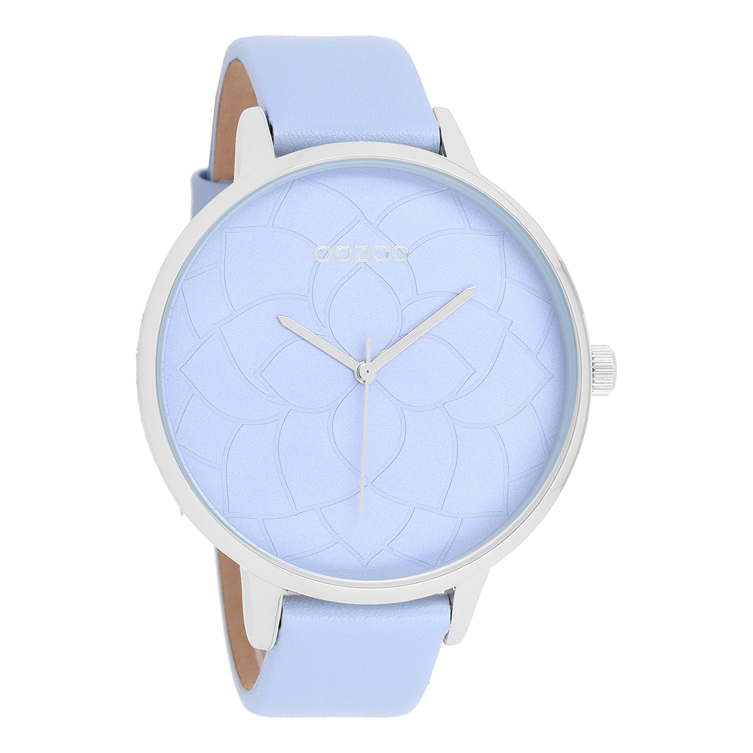 Heben Sie sich mit diesem wunderschönen, runden Damenmodell aus der trendigen OOZOO Timepieces Kollektion hervor. Die C10103 hat ein hellblaues Lederarmband und ein 48 mm großes, silberfarbenes Metallgehäuse. Mit dem lilafarbenen Zifferblatt mit Blumenmuster, ohne Ziffern und mit silberfarbenen Zeigern setzen Sie ein modisches Statement. Diese unverzichtbare Uhr für Ihre Garderobe verfügt über Mineralglas, eine Edelstahl-Rückplatte und ist nickelfrei. Die Uhr verfügt über ein japanisches 2-Uhrwerk und hat 2 Jahre Garantie.