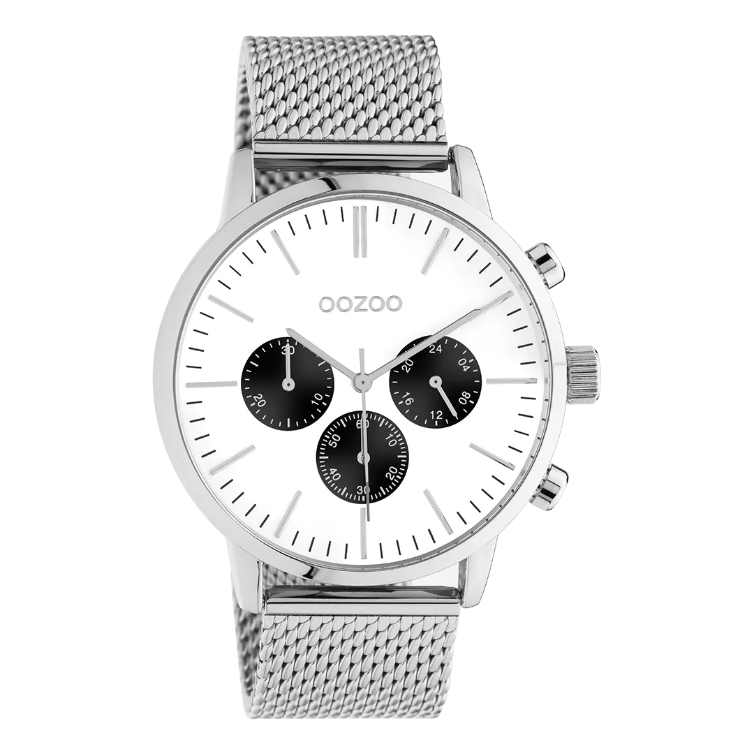 Heben Sie sich mit diesem wunderschönen runden Unisex-Design aus der trendigen OOZOO Timepieces-Kollektion ab. Die C10910 verfügt über ein silberfarbenes Metallgitterarmband und ein 45 mm langes silberfarbenes Metallgehäuse. Mit diesem weißen Chrono-Zifferblatt, den silberfarbenen Streifen, den Ziffern und den passenden Zeigern setzen Sie ein modisches Statement. Diese unverzichtbare Uhr für Ihren Kleiderschrank hat eine Rückplatte aus Mineralglas und Edelstahl und ist nickelsicher.