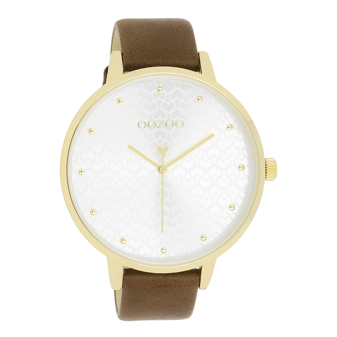 Heben Sie sich mit diesem wunderschönen, runden Damenmodell aus der trendigen OOZOO Timepieces Kollektion hervor. Die C11038 hat ein mattbraunes Lederarmband und ein 48 mm großes, goldfarbenes Metallgehäuse. Mit dem silberfarbenen Zifferblatt mit Herzmuster, den goldfarbenen Punktziffern und den goldfarbenen Zeigern setzen Sie ein modisches Statement. Diese unverzichtbare Uhr für Ihre Garderobe verfügt über Mineralglas, eine Edelstahl-Rückplatte und ist nickelfrei. Die Uhr verfügt über ein japanisches 2-Uhrwerk und hat eine 2-jährige Garantie.
