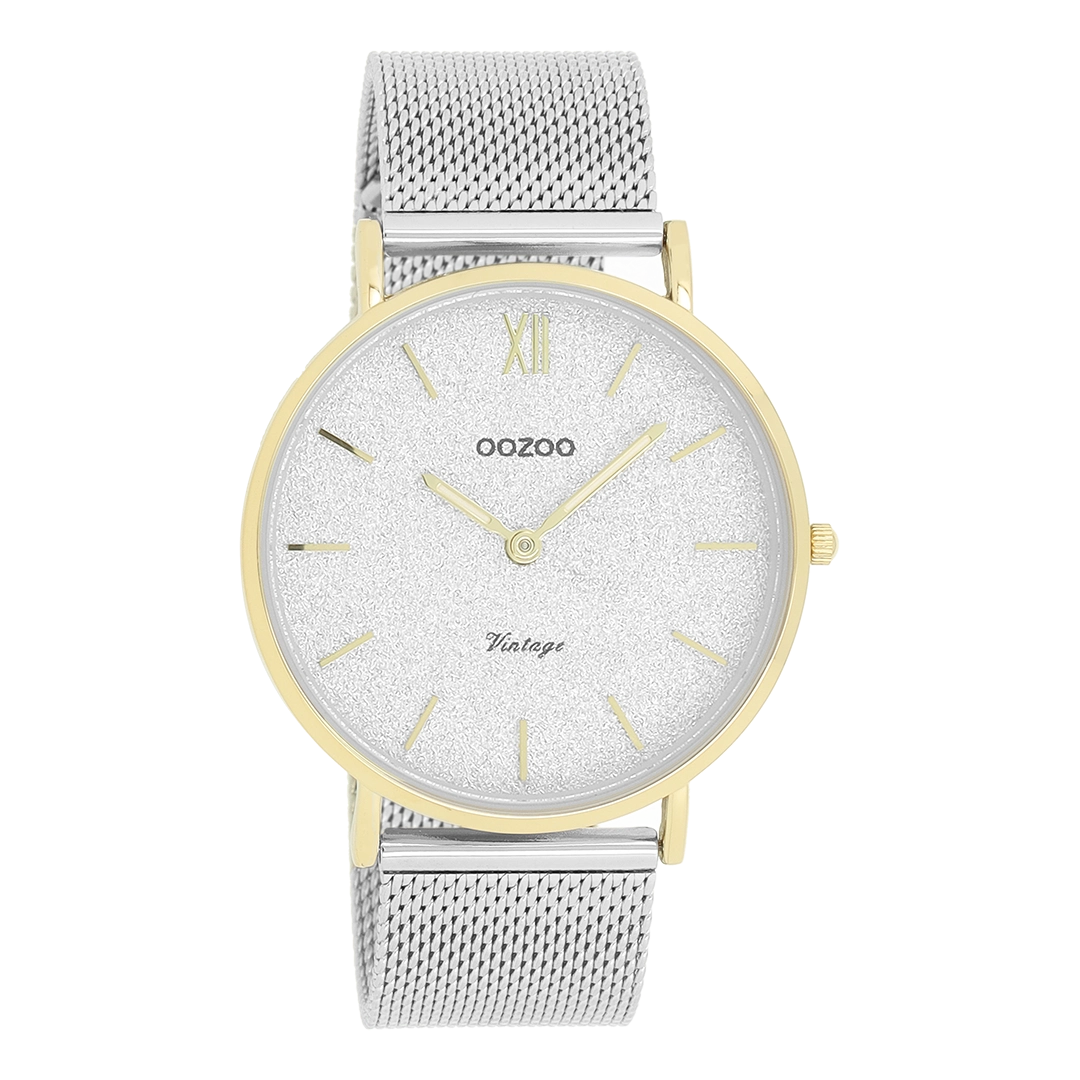Der klassische Look bleibt auch in dieser trendigen Serie ein Muss, und deshalb ist diese runde OOZOO im Vintage-Design mit einem verspielten Augenzwinkern das Must-have der Saison! Diese Damenuhr vereint Mode und Komfort perfekt: Ihr 40-mm-Gehäuse aus goldfarbenem Metall und das silberfarbene, funkelnde Zifferblatt machen sie zu einem trendigen Accessoire für jeden Tag. Das Zifferblatt besticht durch goldfarbene Streifen, Ziffern und passende Zeiger. Die C20117 verleiht Ihrem Outfit das gewisse Etwas. Das Mineralglas liegt in einem nur 6,9 mm flachen Metallgehäuse mit IP-Beschichtung. Der Gehäuseboden ist aus Edelstahl und nickelfrei. Die Uhr ist mit einem japanischen Uhrwerk ausgestattet.