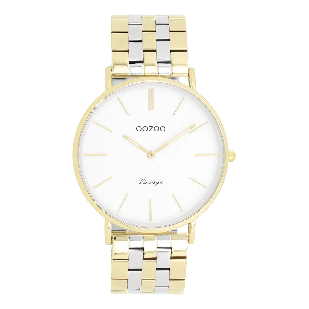 Der klassische Look bleibt in dieser trendigen Serie im Vordergrund und daher ist dieses runde OOZOO Vintage-Design mit einem verspielten Augenzwinkern das Must-Have der Saison! Diese Unisex-Uhr ist mit ihrem 40 mm dicken goldfarbenen Metallgehäuse und dem weißen Zifferblatt die perfekte Kombination aus Mode und Komfort. Das zweifarbige silberfarbene/goldene Edelstahlarmband macht diese Uhr zu einem trendigen Accessoire, das Sie jeden Tag tragen können. Das Zifferblatt hat goldfarbene Streifen, Ziffern und passende Zeiger. Der C20402 verleiht Ihrem Outfit den letzten Glanz. Das Mineralglas liegt in einem mm schlanken Uhrengehäuse aus Metall mit IP-Beschichtung. Diese Konstruktion hat eine Rückplatte aus Edelstahl und ist nickelsicher. Diese Uhr verfügt über ein japanisches 2ATM-Uhrwerk und ist durch eine 2-Jahres-Garantie abgedeckt.