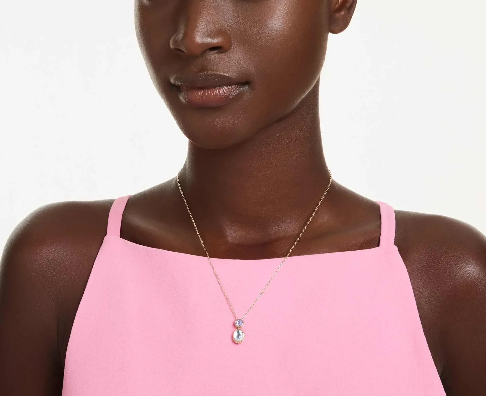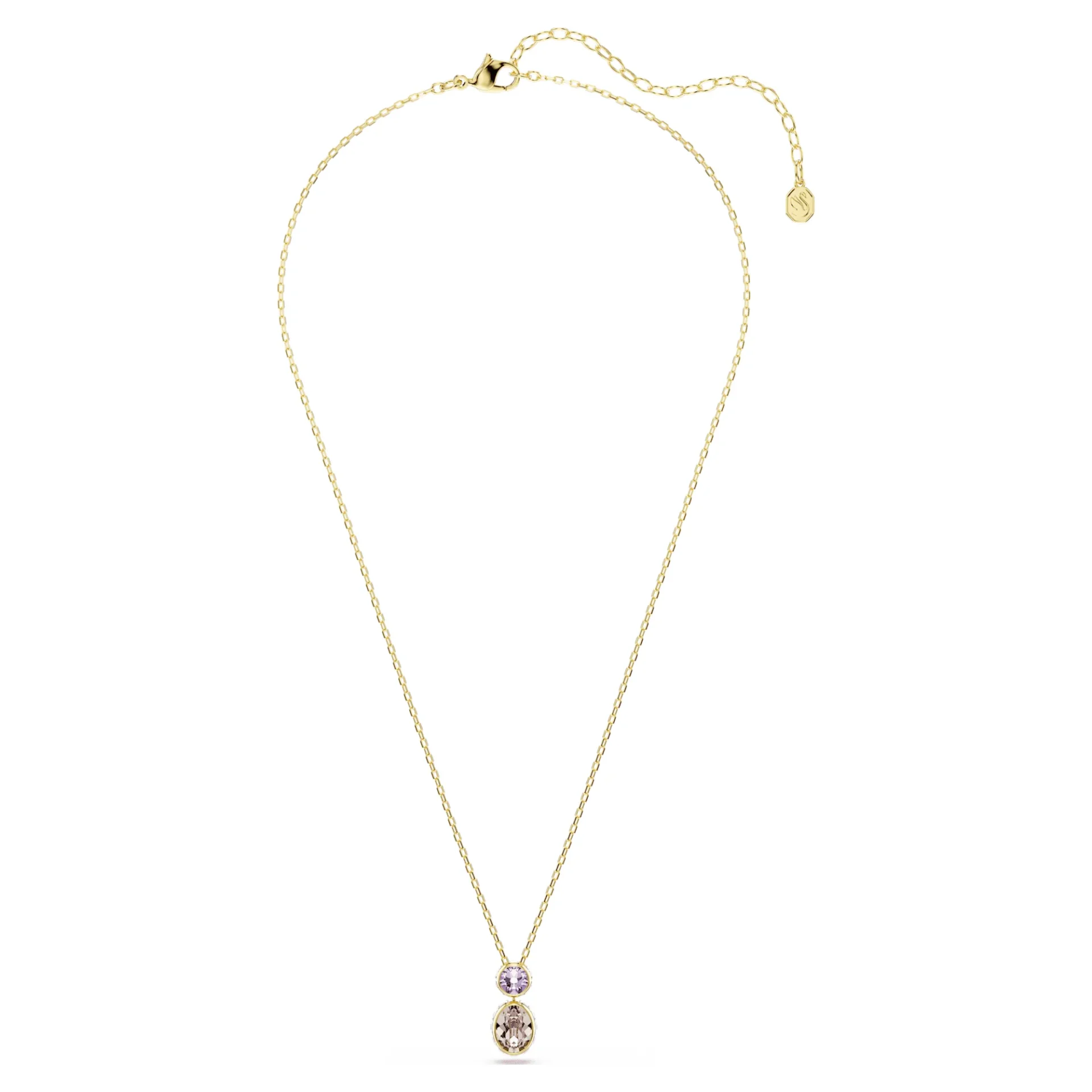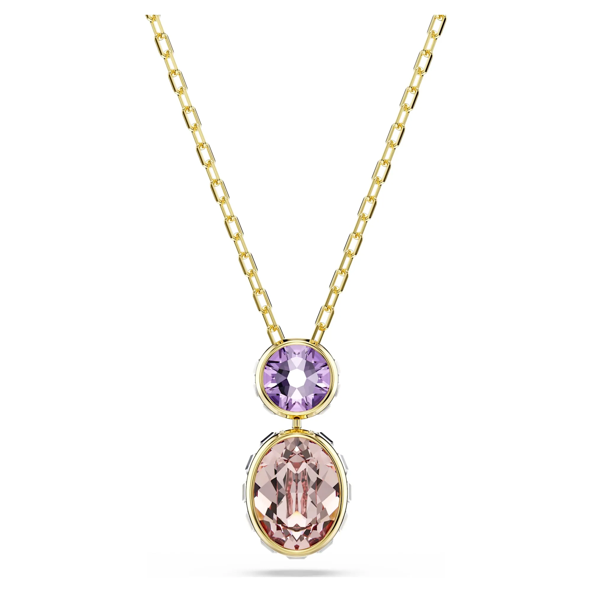 Bei diesem Chroma Anhänger können Sie das Kristallelement nach Lust und Laune drehen und wenden. Das Design in Goldlegierungsschicht präsentiert ein zentrales lilafarbenes Kristallelement und ein größeres, wendbares Element darunter, das auf einer Seite klar und auf der anderen rosa ist. Tragen Sie ihn immer wieder anders, um Ihre Persönlichkeit auszudrücken.